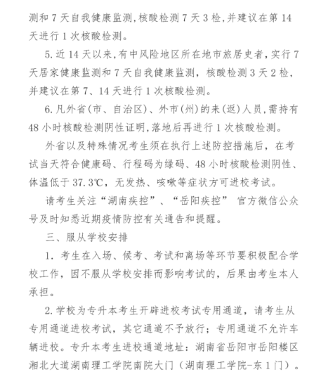 所有参加专升本招生考试的学生需提供入郴前48小时核酸检测报告阴性证明、入郴后3小时内核酸检测报告阴性证明(以上证明截屏备查);考试当天入校门时,需提供48小时核酸检测报告阴性证明,湖南省居民健康码(绿码),行程卡(显示14天内行程在湖南省内且无中高风险地区旅居史)。入校时由校门口疫情防控工作人员核验核酸检测报告、健康码、行程卡,测体温,体温无异常后,在准考证上登记好学生体温并盖章。接受体温测量时须有序进行,严格控制人员行进速度和间距。