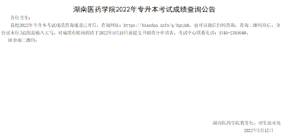 各位考生:我校2022年专升本考试成绩查询通道已开启,查询网址:也可以微信扫码查询,查询二维码附后。身份证末位为X的需输入大写。对成绩有疑问的请于2022年5月18日前提交书面查分申请表。考试中心联系电话:0745-2385040。...