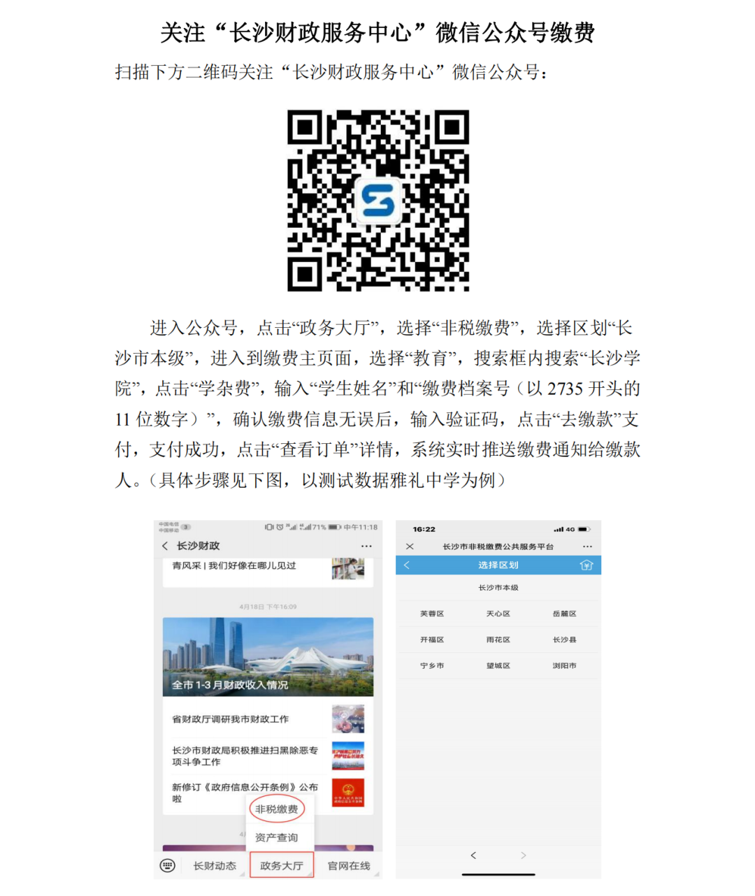 扫描二维码(见附件1)关注“长沙财政服务中心”微信公众号:进入公众号,点击“政务大厅”,选择“非税缴费”,选择区划“长沙市本级”,进入到缴费主页面,选择“教育”,搜索框内搜索“长沙学院”,点击“学杂费”,输入“学生姓名”和“缴费档案号(以2735开头的11位数字,见附件2:2022专升本缴费档案号)”,确认缴费信息无误后,输入验证码,点击“去缴款”支付,支付成功,点击“查看订单”详情,系统实时推送缴费通知给缴款人。(具体步骤见附件1)